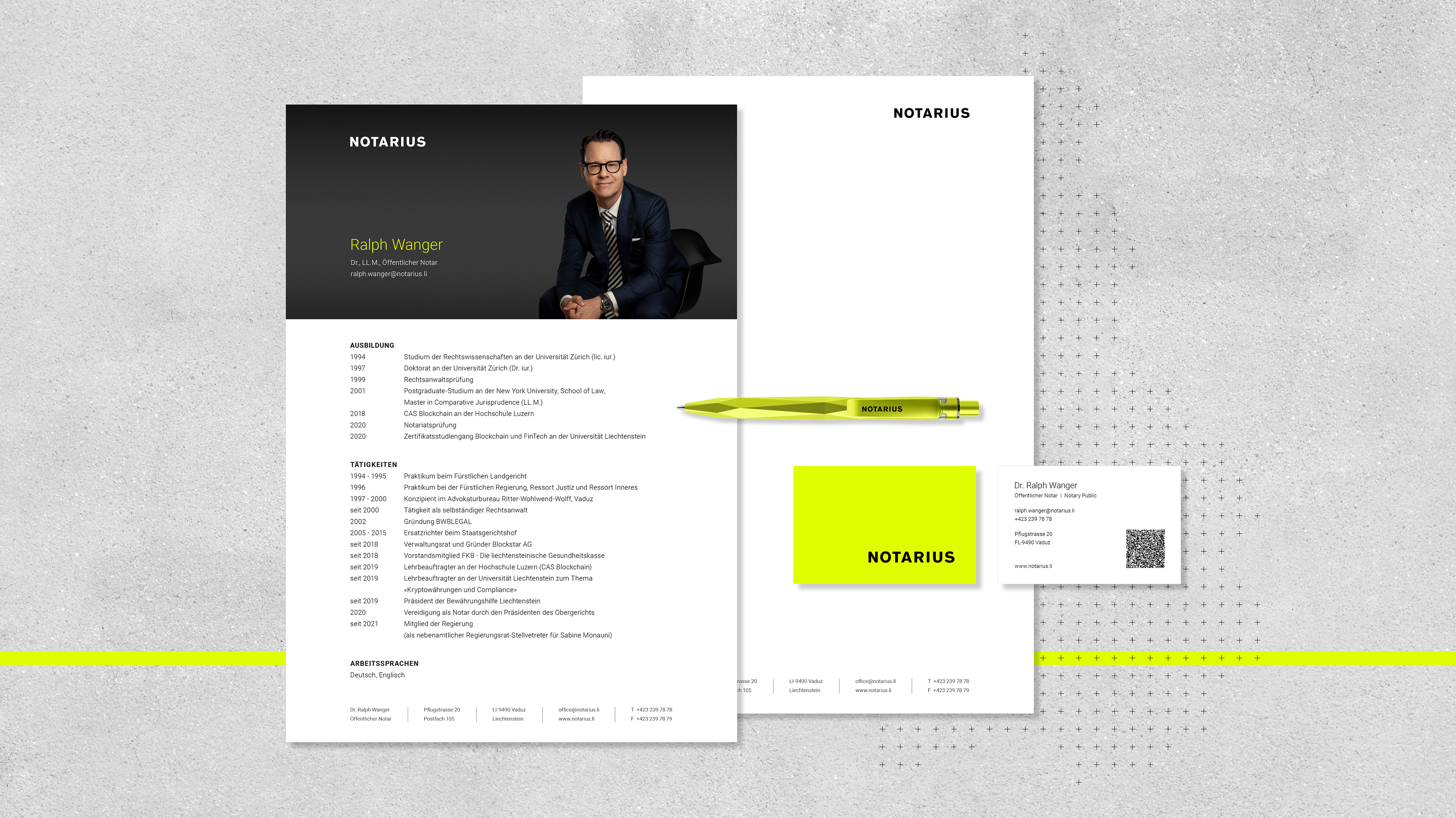 Der Name «Notarius» wirkt traditionell und seriös – gleichzeitig haben wir ihm mit einem klaren Schriftzug und der markanten Farbe Lime einen modernen Twist verliehen. So entstand ein Corporate Design mit starker Wiedererkennung, dass die Zugehörigkeit zur BWBLEGAL Unternehmensgruppe unterstreicht und gleichzeitig eigenständig wirkt.